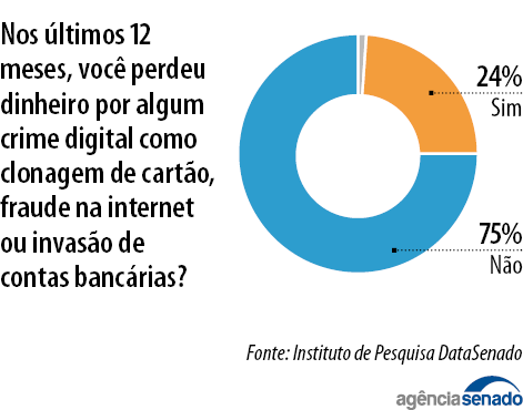 A mesma pesquisa realizada pelo DataSenado demonstrou que 24% dos brasileiros com mais de 16 anos foram vítimas de algum golpe digital. Estima-se que mais de 40 milhões de pessoas perderam dinheiro em função de algum crime cibernético.